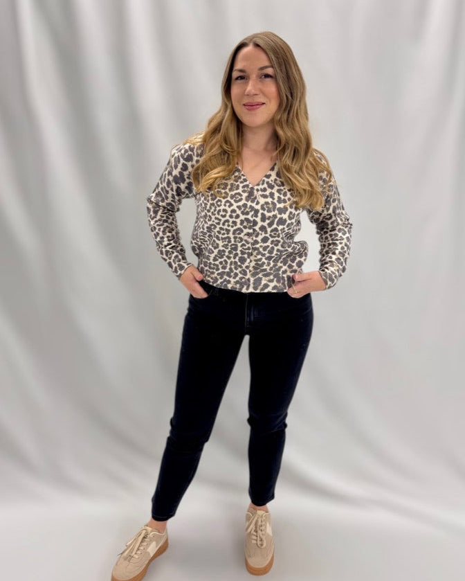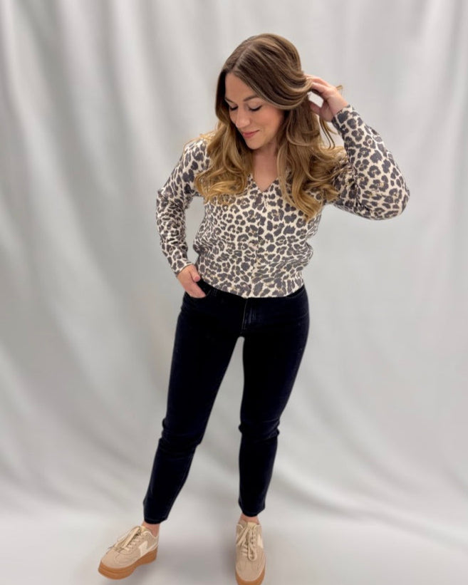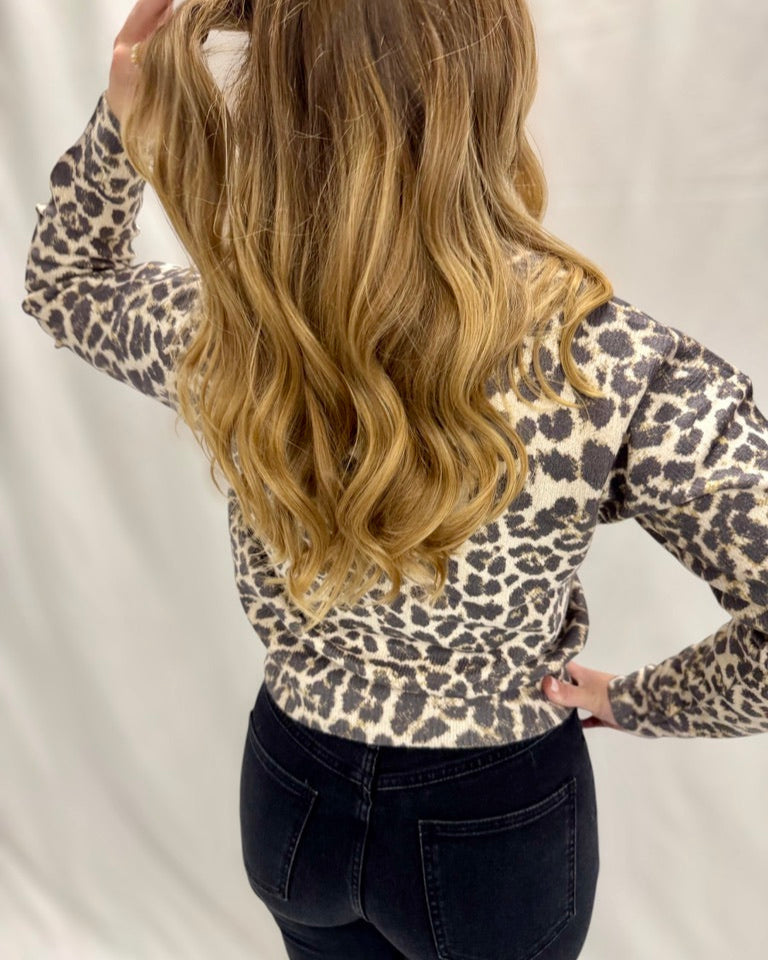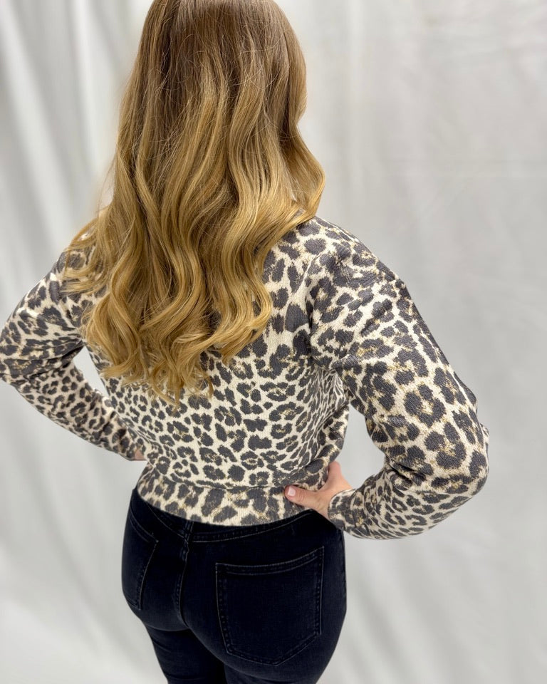 Élisa vereint Wildheit und Glamour: Das eng anliegende Leo-Muster wird durch den feinen Goldfaden im Stoff stilvoll ergänzt und verleiht der Strickjacke einen Hauch von Funkeln.