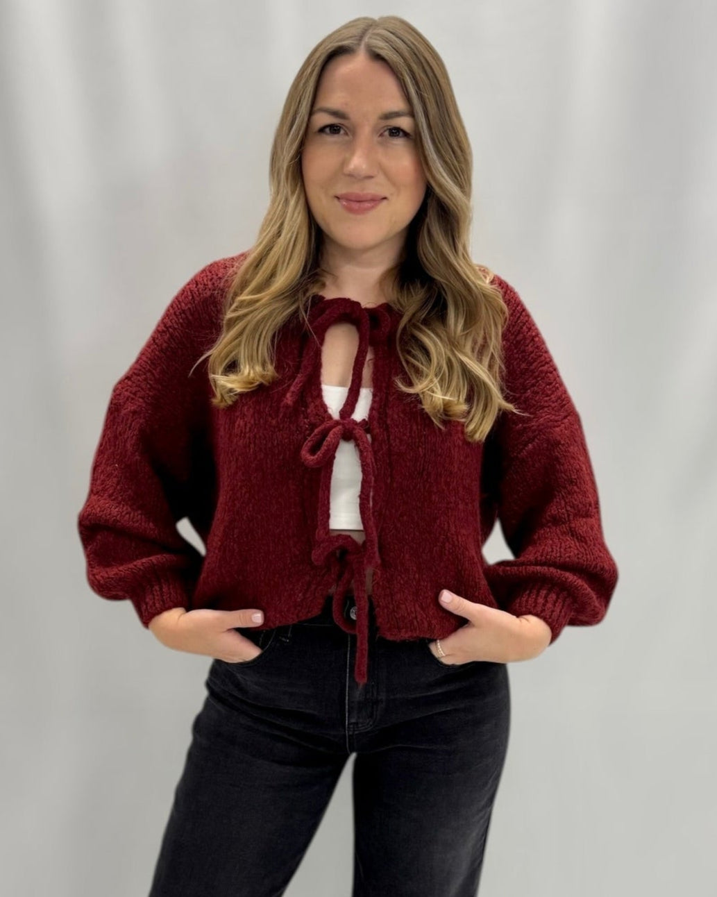 Das weiche Strickmaterial sorgt für Gemütlichkeit, während der warme Bordeaux-Ton deinem Outfit eine elegante Note schenkt. Ob zur Jeans für den Alltag, zum Rock für einen verspielten Look oder über dein Lieblingskleid – Gila ist dein neuer Allrounder mit romantischem Twist.