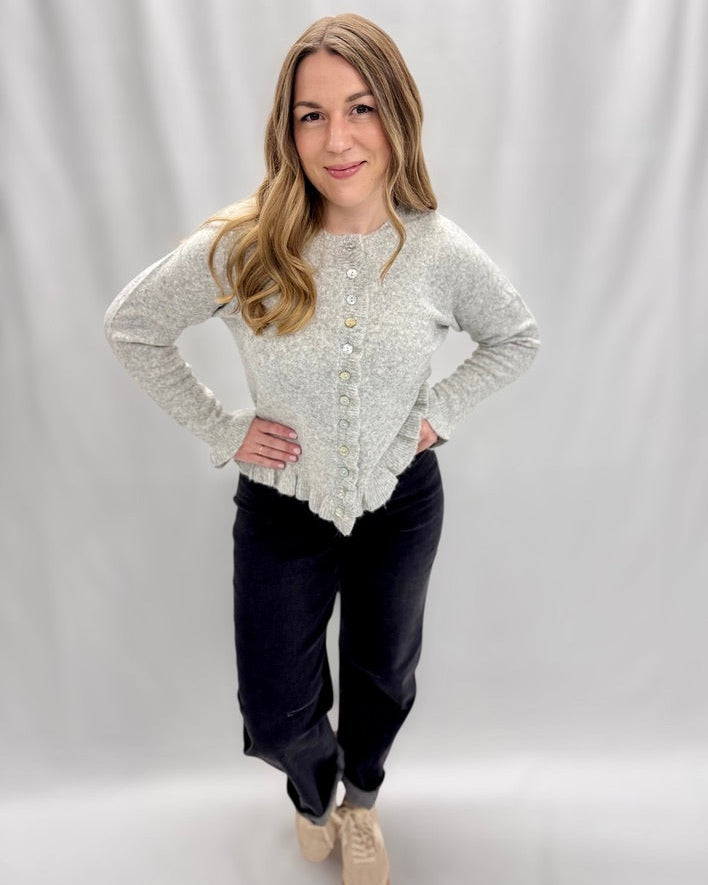 Juliette begeistert mit ihrem enganliegenden Schnitt und zarten Rüschen an Ärmeln, Saum und Knopfleiste. Dieses Detail verleiht der Strickjacke eine romantische, verspielte Note und macht sie zu einem echten Hingucker.