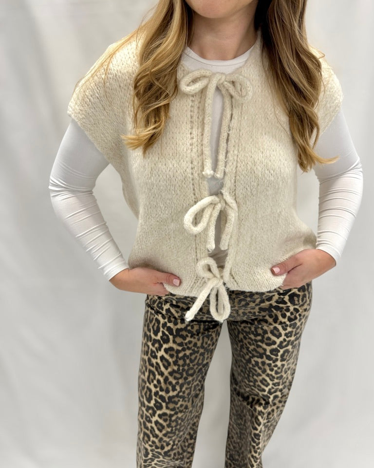 Gila zeigt sich hier als feminine Strickweste mit einem verspielten Twist: Statt klassischer Knöpfe wird sie vorne mit zarten Schleifen gebunden – ein Detail, das sofort Charme und Leichtigkeit versprüht.